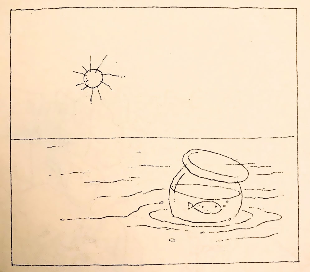 تصور من از کشیدن آن طرح صرفاً این بود که بگویم ما همچون یک ماهی در تنگ کوچک شیشه‌ای در دل دریا اسیریم. اما سید مرتضی آوینی وقتی برای بار اول طرح را دید، پیشانی‌ام را بوسید و گفت: «می‌بینی سید جان چقدر تنهاییم، کمی تلاش کنیم با یک جست می‌توانیم خود را به اقیانوس عشق برسانیم. عشق را می‌بینیم، فاصله‌مان با آن تنها یک جداره نازک شیشه‌ای است اما...»