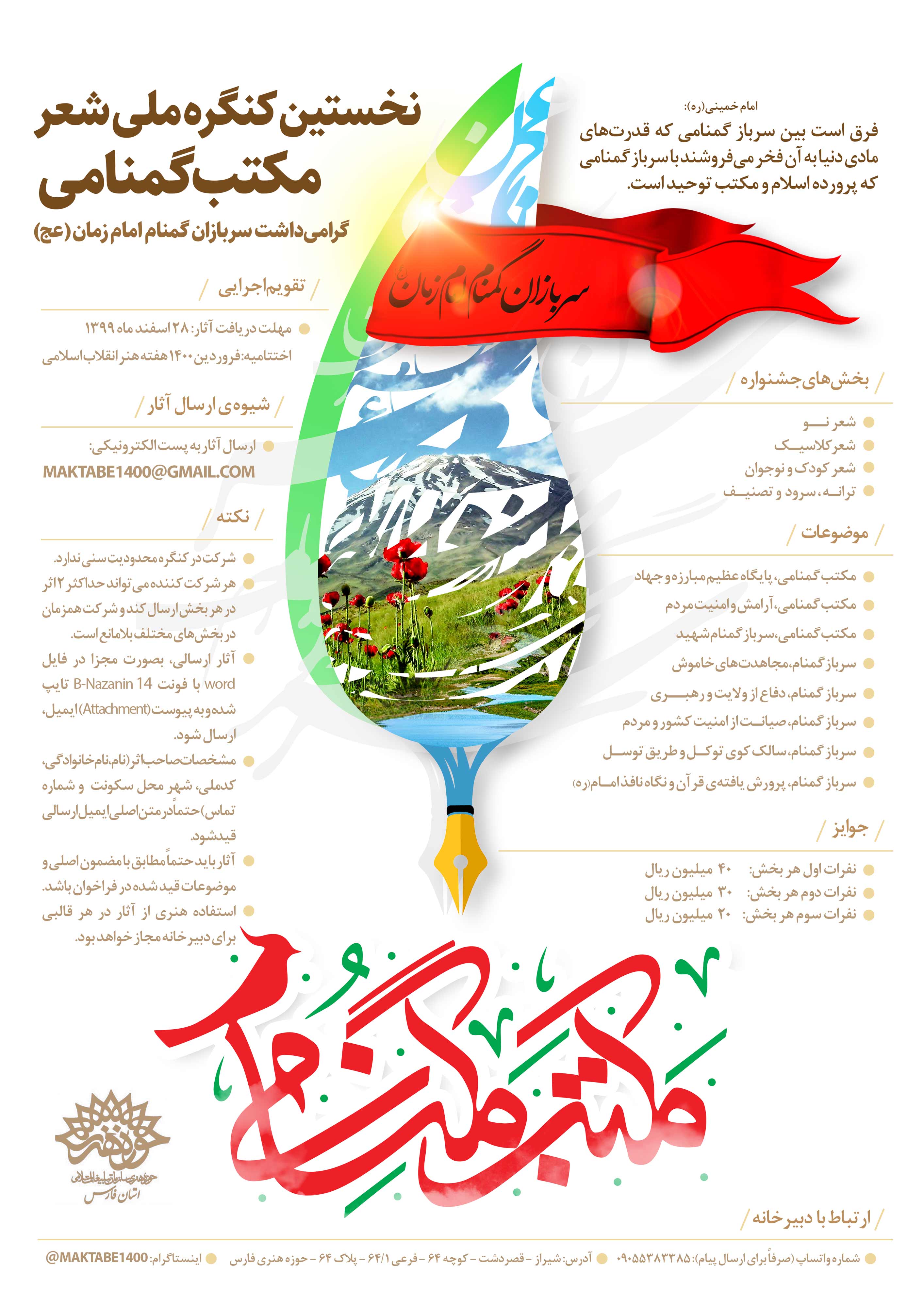 وی در پایان با اشاره به راه های ارتباط با دبیرخانه اظهار داشت: علاوه بر سایت حوزه هنری فارس به نشانی www.artfars.ir و صفحه اینستاگرام به نشانی maktabe1400@ ، شماره واتساپ 09055383385 صرفاً جهت ارسال پیام در دسترس شاعران و علاقه مندان خواهد بود.