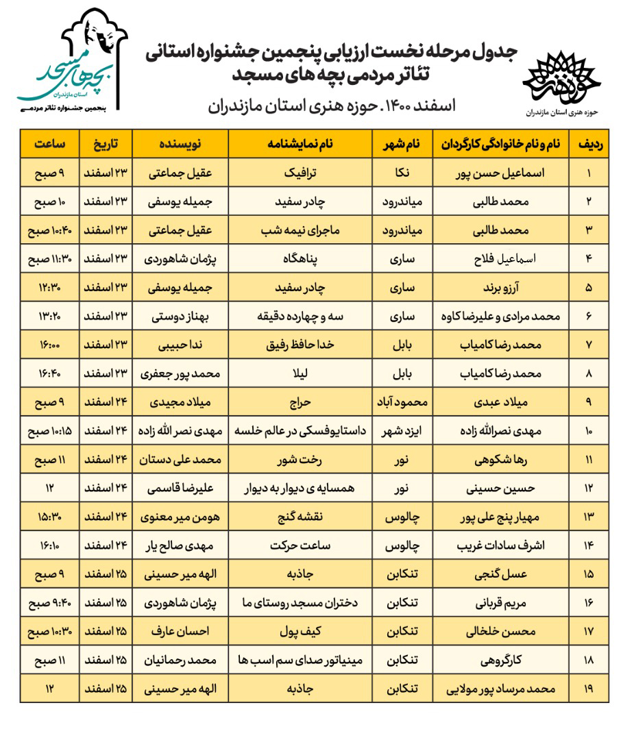 فهرست داوران بازبینی پنجمین دوره جشنواره بچه‌های مسجد مازندران/ جدول بازبینی ۱۷ گروه نمایشی در ۹ شهر مازندران