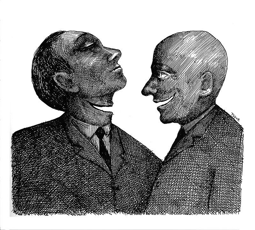 دنیا از دید توپور ترسناک و غیر قابل اعتماد است، حتی جنسیت و عشق هم دردناک و دلهره آورند، نه لذت بخش یا عامل رستگاری. او این اضطراب را با خلق دنیایی سیاه و سورئال نشان می دهد، سورئالیسم او از جنس غریب ترین کابوس های بشری است و نه رویا؛ که انگار رویای فرهنگ و تمدن اروپایی بعد از جنگ جهانی دوم به کابوس تبدیل شد. او به همراه “فرناندو آرابال” شاعر اسپانیایی و “آلخاندرو خودوروسکی” فیلسوف شیلیایی در سال ۱۹۶۲ “جنبش وحشت” را پایه گذاشت تا سورئالیسم را به حرکتی شوک آور و تأثیرگذار بر مخاطبین تبدیل کند. شیوه طراحی توپور به طرز شگرفی قدیمی و کلاسیک می نماید، مثل طراحی ها و تصویرسازی های قرن هجده و نوزده که همین، آنها را رمز آمیزتر می کند و حسی تاریخی به ترس هایش می دهد، همان حسی که تماشای فضا سازی های “بری لیندون” استنلی کوبریک در ما ایجاد می کند، هر دو هنرمند بدبین، ورای تاریخ، تمدن و آیین، شمایل موجود غارنشینی را می بینند که بدویت اش را نقاب می گیرد. هر دو نقاب ها را می درند.