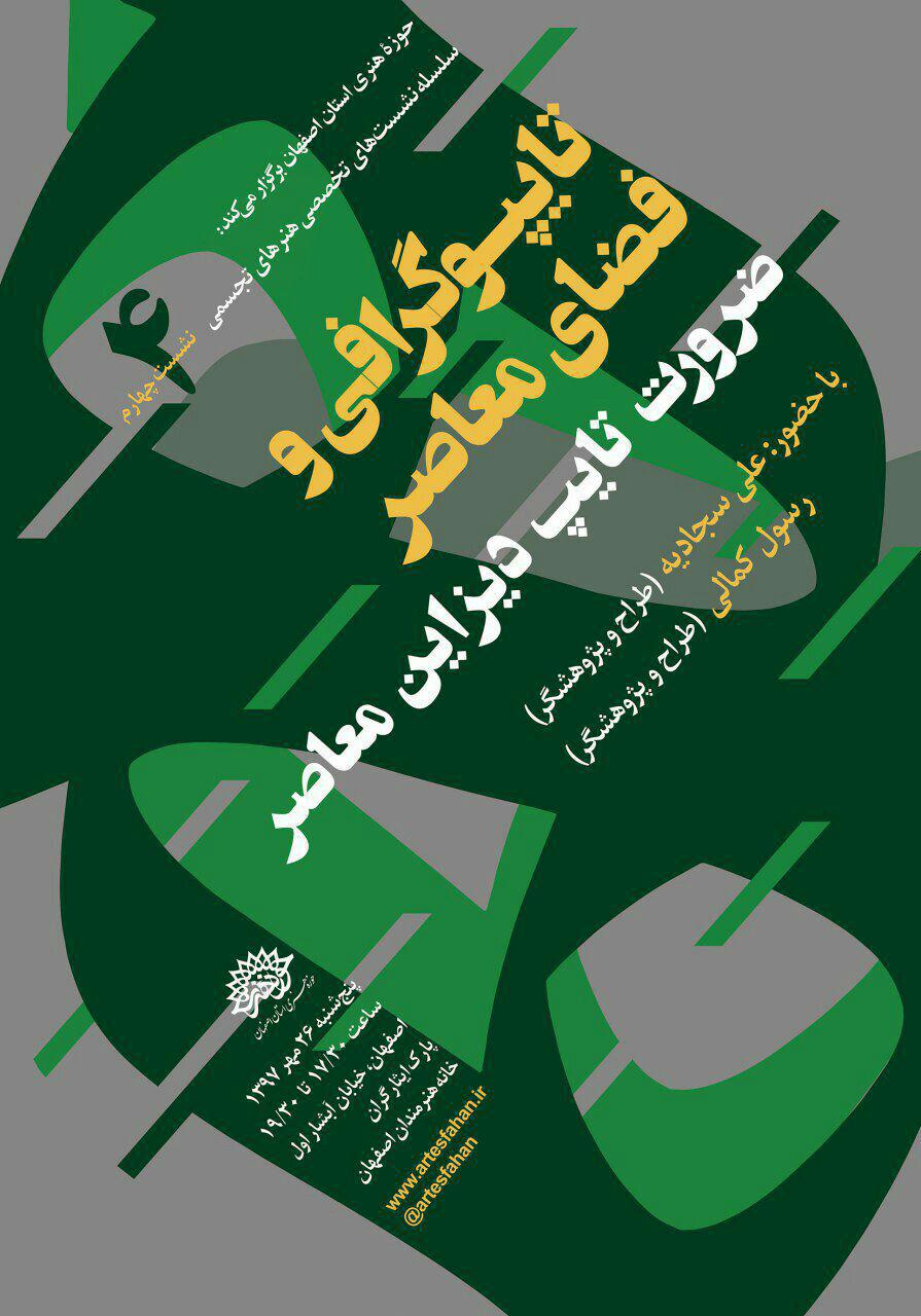 وی افزود: در این نشست همچنین ضرورت تایپ دیزاین معاصر با حضور استادان علی سجادیه و رسول کمالی در ساعت 17:30 الی 19:30 روز پنج شنبه 26 مهر97 برگزار می گردد.