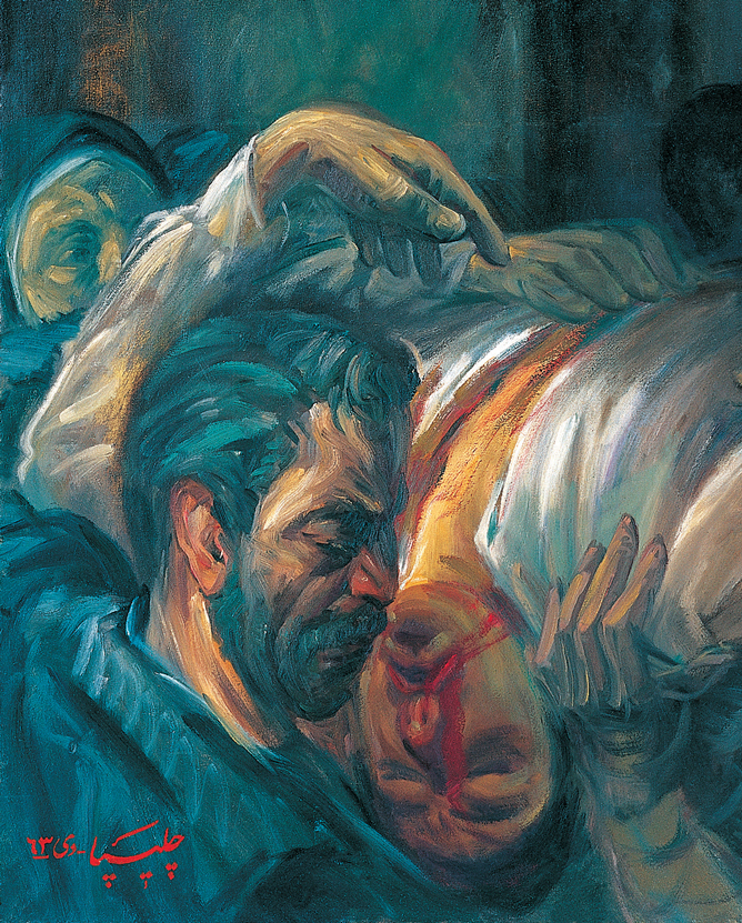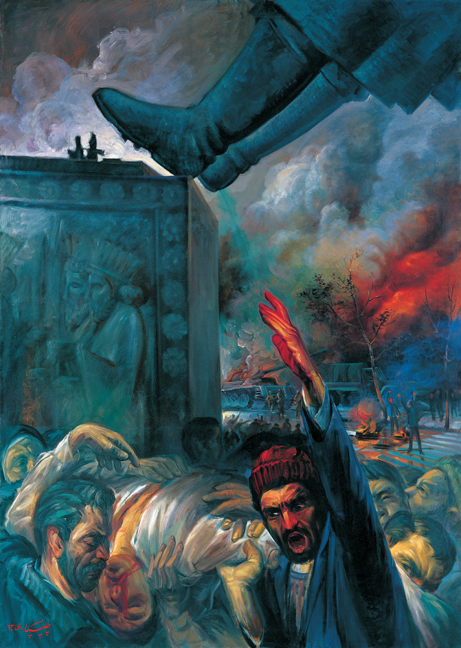 صفحه جلو و نقطه عطف تابلو، فضایی است از حمل شهیدی غرق در خون و بیگناه که توسط عدهای از مردم عادی حمایت و همراهی میشود. لباس شهید به رنگ سفید، و حکایت از بیگناهی و پاکی او دارد. حرکت اُریب دست مردی که در سمت راست تابلو قرار گرفته حاکی از حرکت به سمت جلو بر ضد نظام پادشاهی است که به رنگ خون نقاشی شده است. تصویر این آدم نیز حکایت از راه پر خون و پر حادثهای میکند که مردم ایران در پیشرو داشتند. این اثر در ساختار خود فیگوراتیو است. اغراق در فرم و رنگهای موجود، فضا را به سمت اکسپرسیو نزدیک کرده تا بیان احساسات و شور و حال آن دوران را بیشتر تداعی کند.