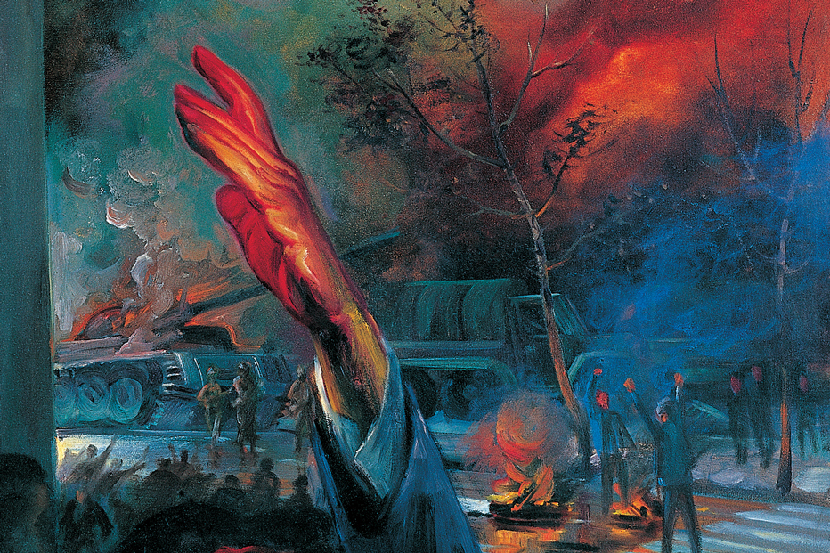 فضا غرق در آتش و خون است. در فضاهای پشت و زمینهای اثر، صفحهای مبهم از تانک و ابزار جنگی نمایان گشته است که عدهای در مقابل این تهاجم نظامی ایستادگی میکنند.