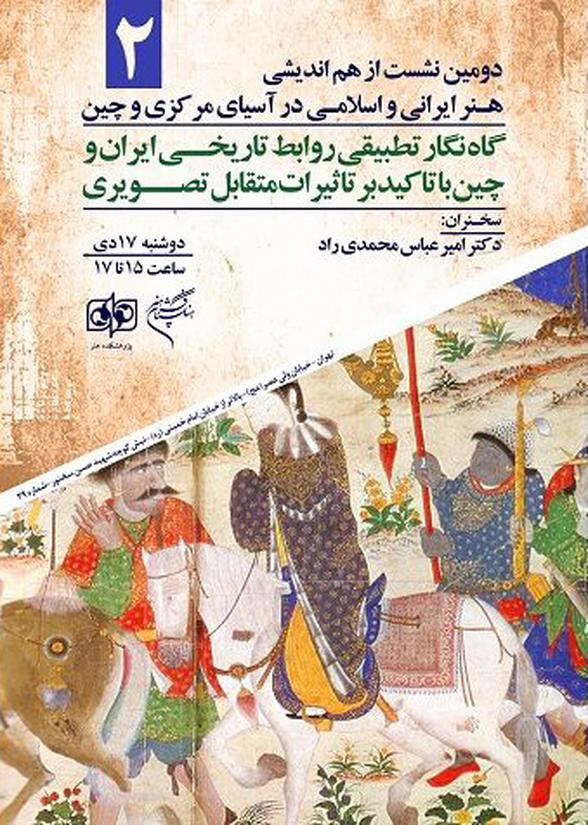 در دومین نشست از هم‌اندیشی "هنر ایرانی و اسلامی در آسیای مرکزی و چین" که به همت "گروه هنر شرق" پژوهشکده هنر برگزار می‌شود، "دکتر امیر عباس محمدی‌راد" با موضوع "گاه‌نگاری تطبیقی روابط تاریخی ایران و چین با تاکید بر تاثیرات متقابل تصویری" سخنرانی می‌کند.