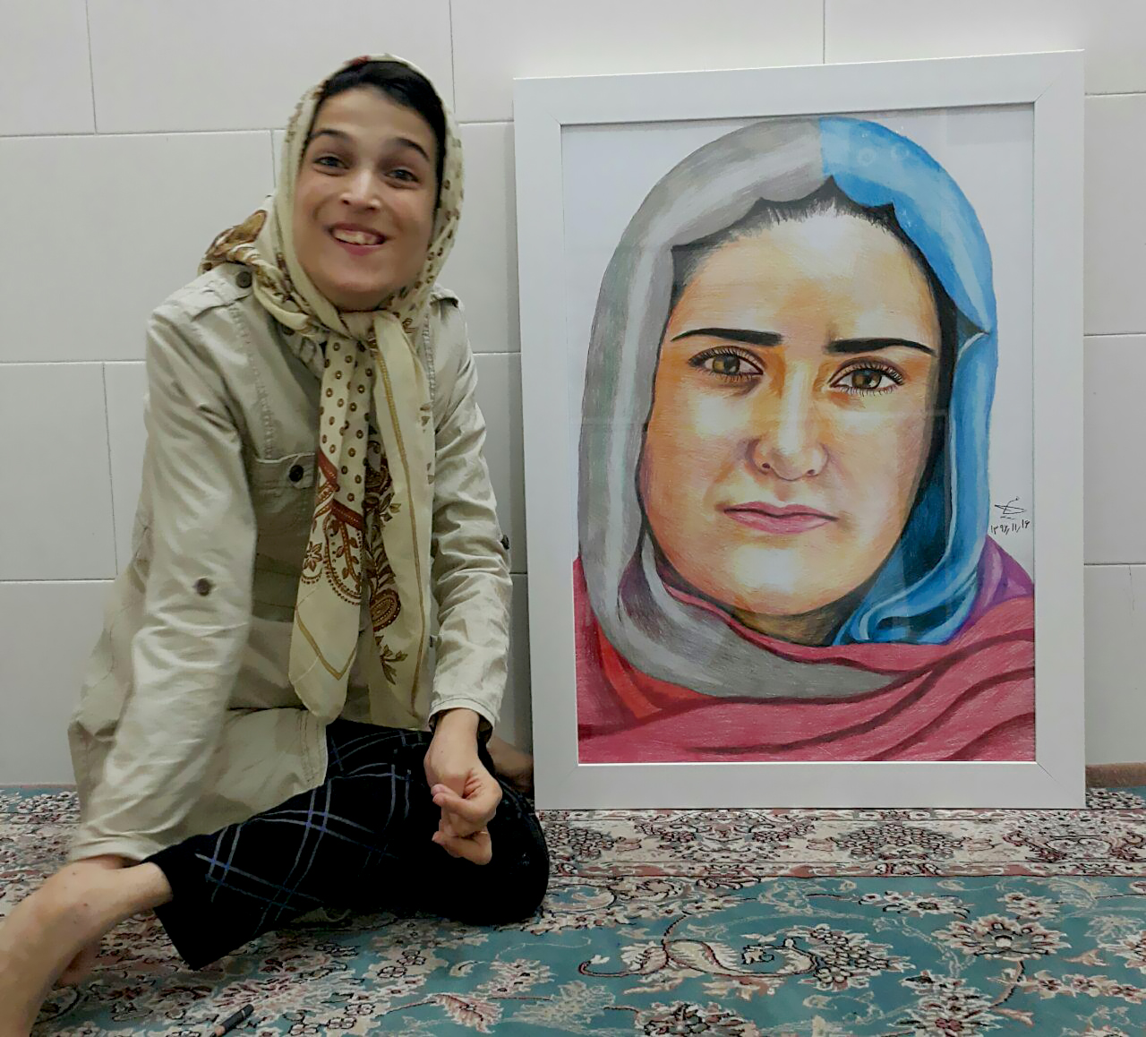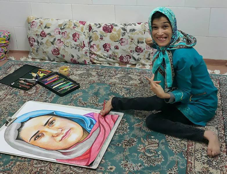 هم اکنون فاطمه تمام کارهایش را با پاهای ضعیف و نحیفش انجام میدهد. او اگرچه «معلول جسمی حرکتی بالغ بر ۸۰ درصد» است اما با لغزش قلم بر روی کاغذ به کمک انگشتان پای خود همه آرزوهایش را نقاشی میکند.