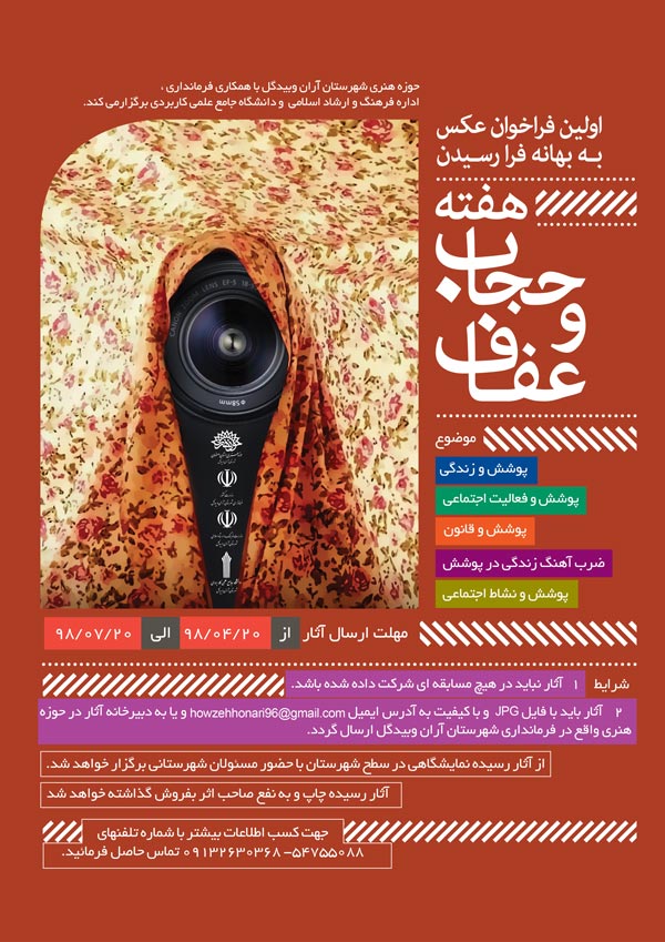 حوزه هنری شهرستان آران وبیدگل با همکاری فرمانداری ، اداره فرهنگ و ارشاد اسلامی و دانشگاه جامع علمی کاربردی به بهانه فرا رسیدن هفته حجاب و عفاف اولین فراخوان عکس حجاب و عفاف را برگزارمی کند.