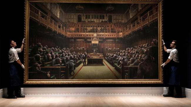 یک نقاشی از بنکسی که نشان دهنده شامپانزه‌ها در مجلس عوام انگلیس است در ساتبیز به قیمت 9.8 میلیون پوند به فروش رفت.